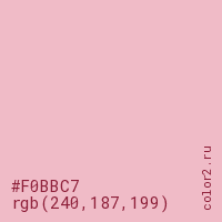 Цвет #F0BBC7 в цветовой модели RGB обозначается тремя октетами (240, 187, 199) в десятичном формате и #F0BBC7 в шестнадцатиричном (hex) формате, которые являются интенсивностью красного 240 (hex F0), интенсивность зелёного 187 (hex BB) и интенсивность синего 199 (hex C7).