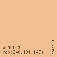 Цвет #F0BF93 в цветовой модели RGB обозначается тремя октетами (240, 191, 147) в десятичном формате и #F0BF93 в шестнадцатиричном (hex) формате, которые являются интенсивностью красного 240 (hex F0), интенсивность зелёного 191 (hex BF) и интенсивность синего 147 (hex 93).