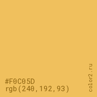 Цвет #F0C05D в цветовой модели RGB обозначается тремя октетами (240, 192, 93) в десятичном формате и #F0C05D в шестнадцатиричном (hex) формате, которые являются интенсивностью красного 240 (hex F0), интенсивность зелёного 192 (hex C0) и интенсивность синего 93 (hex 5D).