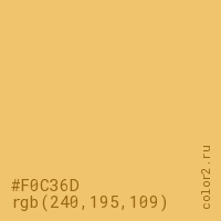 Цвет #F0C36D в цветовой модели RGB обозначается тремя октетами (240, 195, 109) в десятичном формате и #F0C36D в шестнадцатиричном (hex) формате, которые являются интенсивностью красного 240 (hex F0), интенсивность зелёного 195 (hex C3) и интенсивность синего 109 (hex 6D).