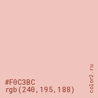 Цвет #F0C3BC в цветовой модели RGB обозначается тремя октетами (240, 195, 188) в десятичном формате и #F0C3BC в шестнадцатиричном (hex) формате, которые являются интенсивностью красного 240 (hex F0), интенсивность зелёного 195 (hex C3) и интенсивность синего 188 (hex BC).