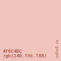 Цвет #F0C4BC в цветовой модели RGB обозначается тремя октетами (240, 196, 188) в десятичном формате и #F0C4BC в шестнадцатиричном (hex) формате, которые являются интенсивностью красного 240 (hex F0), интенсивность зелёного 196 (hex C4) и интенсивность синего 188 (hex BC).