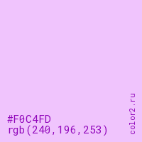 Цвет RGB(240, 196, 253) в процентом отношении количества цвета состоит из 94.1% красного (red), 76.9% зелёного (green) и 99.2% синего (blue).