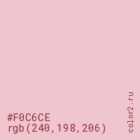 Цвет #F0C6CE в цветовой модели RGB обозначается тремя октетами (240, 198, 206) в десятичном формате и #F0C6CE в шестнадцатиричном (hex) формате, которые являются интенсивностью красного 240 (hex F0), интенсивность зелёного 198 (hex C6) и интенсивность синего 206 (hex CE).