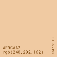 Цвет #F0CAA2 в цветовой модели RGB обозначается тремя октетами (240, 202, 162) в десятичном формате и #F0CAA2 в шестнадцатиричном (hex) формате, которые являются интенсивностью красного 240 (hex F0), интенсивность зелёного 202 (hex CA) и интенсивность синего 162 (hex A2).