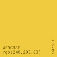 Цвет #F0CB3F в цветовой модели RGB обозначается тремя октетами (240, 203, 63) в десятичном формате и #F0CB3F в шестнадцатиричном (hex) формате, которые являются интенсивностью красного 240 (hex F0), интенсивность зелёного 203 (hex CB) и интенсивность синего 63 (hex 3F).