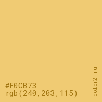 Цвет #F0CB73 в цветовой модели RGB обозначается тремя октетами (240, 203, 115) в десятичном формате и #F0CB73 в шестнадцатиричном (hex) формате, которые являются интенсивностью красного 240 (hex F0), интенсивность зелёного 203 (hex CB) и интенсивность синего 115 (hex 73).