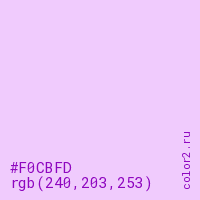 Цвет #F0CBFD в цветовой модели RGB обозначается тремя октетами (240, 203, 253) в десятичном формате и #F0CBFD в шестнадцатиричном (hex) формате, которые являются интенсивностью красного 240 (hex F0), интенсивность зелёного 203 (hex CB) и интенсивность синего 253 (hex FD).