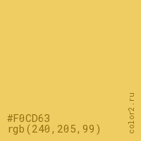 Цвет #F0CD63 в цветовой модели RGB обозначается тремя октетами (240, 205, 99) в десятичном формате и #F0CD63 в шестнадцатиричном (hex) формате, которые являются интенсивностью красного 240 (hex F0), интенсивность зелёного 205 (hex CD) и интенсивность синего 99 (hex 63).
