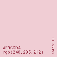 Цвет #F0CDD4 в цветовой модели RGB обозначается тремя октетами (240, 205, 212) в десятичном формате и #F0CDD4 в шестнадцатиричном (hex) формате, которые являются интенсивностью красного 240 (hex F0), интенсивность зелёного 205 (hex CD) и интенсивность синего 212 (hex D4).