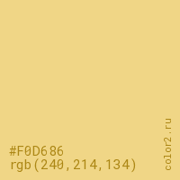 Цвет #F0D686 в цветовой модели RGB обозначается тремя октетами (240, 214, 134) в десятичном формате и #F0D686 в шестнадцатиричном (hex) формате, которые являются интенсивностью красного 240 (hex F0), интенсивность зелёного 214 (hex D6) и интенсивность синего 134 (hex 86).