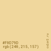 Цвет #F0D79D в цветовой модели RGB обозначается тремя октетами (240, 215, 157) в десятичном формате и #F0D79D в шестнадцатиричном (hex) формате, которые являются интенсивностью красного 240 (hex F0), интенсивность зелёного 215 (hex D7) и интенсивность синего 157 (hex 9D).