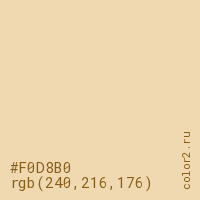Цвет #F0D8B0 в цветовой модели RGB обозначается тремя октетами (240, 216, 176) в десятичном формате и #F0D8B0 в шестнадцатиричном (hex) формате, которые являются интенсивностью красного 240 (hex F0), интенсивность зелёного 216 (hex D8) и интенсивность синего 176 (hex B0).