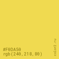 Цвет #F0DA50 в цветовой модели RGB обозначается тремя октетами (240, 218, 80) в десятичном формате и #F0DA50 в шестнадцатиричном (hex) формате, которые являются интенсивностью красного 240 (hex F0), интенсивность зелёного 218 (hex DA) и интенсивность синего 80 (hex 50).