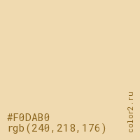 Цвет #F0DAB0 в цветовой модели RGB обозначается тремя октетами (240, 218, 176) в десятичном формате и #F0DAB0 в шестнадцатиричном (hex) формате, которые являются интенсивностью красного 240 (hex F0), интенсивность зелёного 218 (hex DA) и интенсивность синего 176 (hex B0).