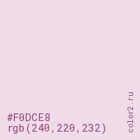 Цвет #F0DCE8 в цветовой модели RGB обозначается тремя октетами (240, 220, 232) в десятичном формате и #F0DCE8 в шестнадцатиричном (hex) формате, которые являются интенсивностью красного 240 (hex F0), интенсивность зелёного 220 (hex DC) и интенсивность синего 232 (hex E8).
