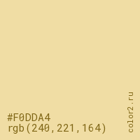 Цвет #F0DDA4 в цветовой модели RGB обозначается тремя октетами (240, 221, 164) в десятичном формате и #F0DDA4 в шестнадцатиричном (hex) формате, которые являются интенсивностью красного 240 (hex F0), интенсивность зелёного 221 (hex DD) и интенсивность синего 164 (hex A4).
