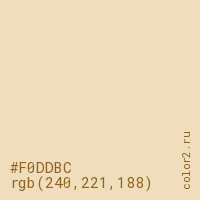 Цвет #F0DDBC в цветовой модели RGB обозначается тремя октетами (240, 221, 188) в десятичном формате и #F0DDBC в шестнадцатиричном (hex) формате, которые являются интенсивностью красного 240 (hex F0), интенсивность зелёного 221 (hex DD) и интенсивность синего 188 (hex BC).