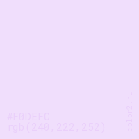 Цвет #F0DEFC в цветовой модели RGB обозначается тремя октетами (240, 222, 252) в десятичном формате и #F0DEFC в шестнадцатиричном (hex) формате, которые являются интенсивностью красного 240 (hex F0), интенсивность зелёного 222 (hex DE) и интенсивность синего 252 (hex FC).