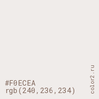 Цвет RGB(240, 236, 234) в процентом отношении количества цвета состоит из 94.1% красного (red), 92.5% зелёного (green) и 91.8% синего (blue).