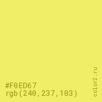 Цвет #F0ED67 в цветовой модели RGB обозначается тремя октетами (240, 237, 103) в десятичном формате и #F0ED67 в шестнадцатиричном (hex) формате, которые являются интенсивностью красного 240 (hex F0), интенсивность зелёного 237 (hex ED) и интенсивность синего 103 (hex 67).