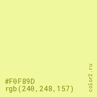 Цвет #F0F89D в цветовой модели RGB обозначается тремя октетами (240, 248, 157) в десятичном формате и #F0F89D в шестнадцатиричном (hex) формате, которые являются интенсивностью красного 240 (hex F0), интенсивность зелёного 248 (hex F8) и интенсивность синего 157 (hex 9D).