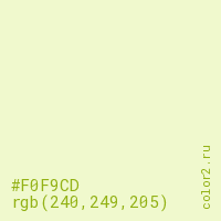 Цвет #F0F9CD в цветовой модели RGB обозначается тремя октетами (240, 249, 205) в десятичном формате и #F0F9CD в шестнадцатиричном (hex) формате, которые являются интенсивностью красного 240 (hex F0), интенсивность зелёного 249 (hex F9) и интенсивность синего 205 (hex CD).