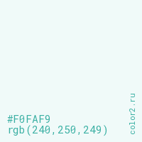 Цвет RGB(240, 250, 249) в процентом отношении количества цвета состоит из 94.1% красного (red), 98% зелёного (green) и 97.6% синего (blue).