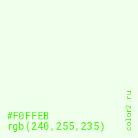 Цвет #F0FFEB в цветовой модели RGB обозначается тремя октетами (240, 255, 235) в десятичном формате и #F0FFEB в шестнадцатиричном (hex) формате, которые являются интенсивностью красного 240 (hex F0), интенсивность зелёного 255 (hex FF) и интенсивность синего 235 (hex EB).
