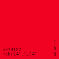 Цвет #F10122 в цветовой модели RGB обозначается тремя октетами (241, 1, 34) в десятичном формате и #F10122 в шестнадцатиричном (hex) формате, которые являются интенсивностью красного 241 (hex F1), интенсивность зелёного 1 (hex 01) и интенсивность синего 34 (hex 22).