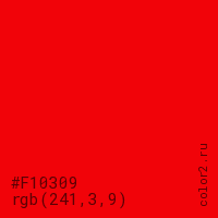 Цвет #F10309 в цветовой модели RGB обозначается тремя октетами (241, 3, 9) в десятичном формате и #F10309 в шестнадцатиричном (hex) формате, которые являются интенсивностью красного 241 (hex F1), интенсивность зелёного 3 (hex 03) и интенсивность синего 9 (hex 09).