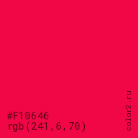 Цвет #F10646 в цветовой модели RGB обозначается тремя октетами (241, 6, 70) в десятичном формате и #F10646 в шестнадцатиричном (hex) формате, которые являются интенсивностью красного 241 (hex F1), интенсивность зелёного 6 (hex 06) и интенсивность синего 70 (hex 46).