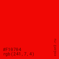 Цвет #F10704 в цветовой модели RGB обозначается тремя октетами (241, 7, 4) в десятичном формате и #F10704 в шестнадцатиричном (hex) формате, которые являются интенсивностью красного 241 (hex F1), интенсивность зелёного 7 (hex 07) и интенсивность синего 4 (hex 04).