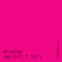 Цвет #F10783 в цветовой модели RGB обозначается тремя октетами (241, 7, 131) в десятичном формате и #F10783 в шестнадцатиричном (hex) формате, которые являются интенсивностью красного 241 (hex F1), интенсивность зелёного 7 (hex 07) и интенсивность синего 131 (hex 83).