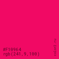 Цвет #F10964 в цветовой модели RGB обозначается тремя октетами (241, 9, 100) в десятичном формате и #F10964 в шестнадцатиричном (hex) формате, которые являются интенсивностью красного 241 (hex F1), интенсивность зелёного 9 (hex 09) и интенсивность синего 100 (hex 64).
