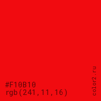 Цвет #F10B10 в цветовой модели RGB обозначается тремя октетами (241, 11, 16) в десятичном формате и #F10B10 в шестнадцатиричном (hex) формате, которые являются интенсивностью красного 241 (hex F1), интенсивность зелёного 11 (hex 0B) и интенсивность синего 16 (hex 10).