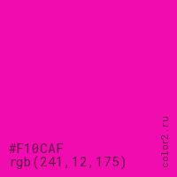 Цвет #F10CAF в цветовой модели RGB обозначается тремя октетами (241, 12, 175) в десятичном формате и #F10CAF в шестнадцатиричном (hex) формате, которые являются интенсивностью красного 241 (hex F1), интенсивность зелёного 12 (hex 0C) и интенсивность синего 175 (hex AF).