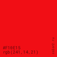 Цвет #F10E15 в цветовой модели RGB обозначается тремя октетами (241, 14, 21) в десятичном формате и #F10E15 в шестнадцатиричном (hex) формате, которые являются интенсивностью красного 241 (hex F1), интенсивность зелёного 14 (hex 0E) и интенсивность синего 21 (hex 15).