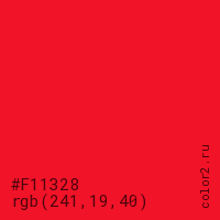 Цвет #F11328 в цветовой модели RGB обозначается тремя октетами (241, 19, 40) в десятичном формате и #F11328 в шестнадцатиричном (hex) формате, которые являются интенсивностью красного 241 (hex F1), интенсивность зелёного 19 (hex 13) и интенсивность синего 40 (hex 28).