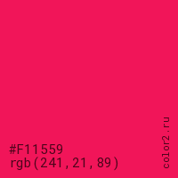 Цвет #F11559 в цветовой модели RGB обозначается тремя октетами (241, 21, 89) в десятичном формате и #F11559 в шестнадцатиричном (hex) формате, которые являются интенсивностью красного 241 (hex F1), интенсивность зелёного 21 (hex 15) и интенсивность синего 89 (hex 59).