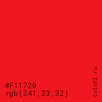 Цвет #F11720 в цветовой модели RGB обозначается тремя октетами (241, 23, 32) в десятичном формате и #F11720 в шестнадцатиричном (hex) формате, которые являются интенсивностью красного 241 (hex F1), интенсивность зелёного 23 (hex 17) и интенсивность синего 32 (hex 20).