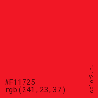 Цвет #F11725 в цветовой модели RGB обозначается тремя октетами (241, 23, 37) в десятичном формате и #F11725 в шестнадцатиричном (hex) формате, которые являются интенсивностью красного 241 (hex F1), интенсивность зелёного 23 (hex 17) и интенсивность синего 37 (hex 25).