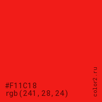 Цвет #F11C18 в цветовой модели RGB обозначается тремя октетами (241, 28, 24) в десятичном формате и #F11C18 в шестнадцатиричном (hex) формате, которые являются интенсивностью красного 241 (hex F1), интенсивность зелёного 28 (hex 1C) и интенсивность синего 24 (hex 18).