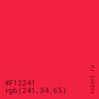 Цвет #F12241 в цветовой модели RGB обозначается тремя октетами (241, 34, 65) в десятичном формате и #F12241 в шестнадцатиричном (hex) формате, которые являются интенсивностью красного 241 (hex F1), интенсивность зелёного 34 (hex 22) и интенсивность синего 65 (hex 41).