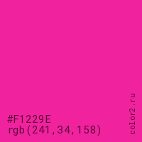 Цвет #F1229E в цветовой модели RGB обозначается тремя октетами (241, 34, 158) в десятичном формате и #F1229E в шестнадцатиричном (hex) формате, которые являются интенсивностью красного 241 (hex F1), интенсивность зелёного 34 (hex 22) и интенсивность синего 158 (hex 9E).