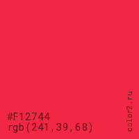 Цвет #F12744 в цветовой модели RGB обозначается тремя октетами (241, 39, 68) в десятичном формате и #F12744 в шестнадцатиричном (hex) формате, которые являются интенсивностью красного 241 (hex F1), интенсивность зелёного 39 (hex 27) и интенсивность синего 68 (hex 44).