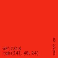 Цвет #F12818 в цветовой модели RGB обозначается тремя октетами (241, 40, 24) в десятичном формате и #F12818 в шестнадцатиричном (hex) формате, которые являются интенсивностью красного 241 (hex F1), интенсивность зелёного 40 (hex 28) и интенсивность синего 24 (hex 18).