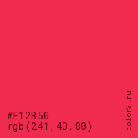 Цвет #F12B50 в цветовой модели RGB обозначается тремя октетами (241, 43, 80) в десятичном формате и #F12B50 в шестнадцатиричном (hex) формате, которые являются интенсивностью красного 241 (hex F1), интенсивность зелёного 43 (hex 2B) и интенсивность синего 80 (hex 50).