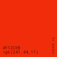 Цвет #F12C0B в цветовой модели RGB обозначается тремя октетами (241, 44, 11) в десятичном формате и #F12C0B в шестнадцатиричном (hex) формате, которые являются интенсивностью красного 241 (hex F1), интенсивность зелёного 44 (hex 2C) и интенсивность синего 11 (hex 0B).