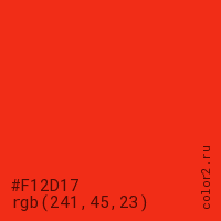 Цвет #F12D17 в цветовой модели RGB обозначается тремя октетами (241, 45, 23) в десятичном формате и #F12D17 в шестнадцатиричном (hex) формате, которые являются интенсивностью красного 241 (hex F1), интенсивность зелёного 45 (hex 2D) и интенсивность синего 23 (hex 17).